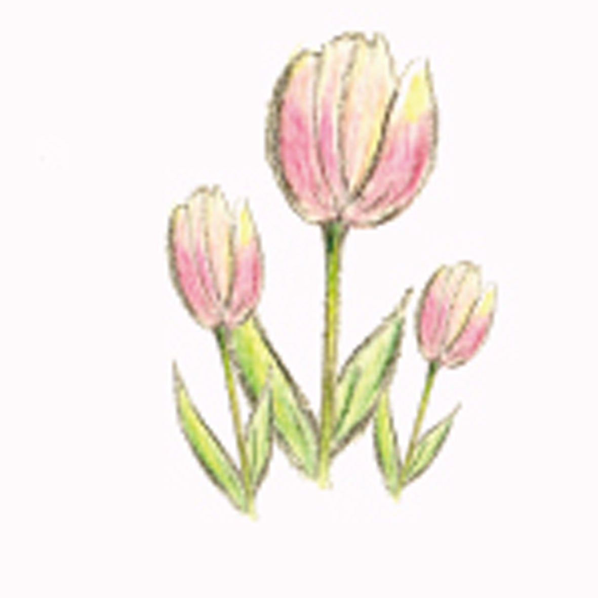 パステルピンク色のポストカードに色鉛筆で描いたチューリップが咲いています♪